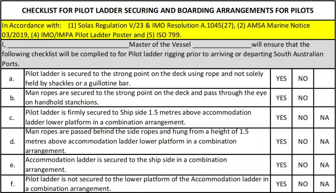 ·在抵達南澳大利亞港口之前,所有船長都應(yīng)填寫隨附的引航梯固定和登船安排清單。