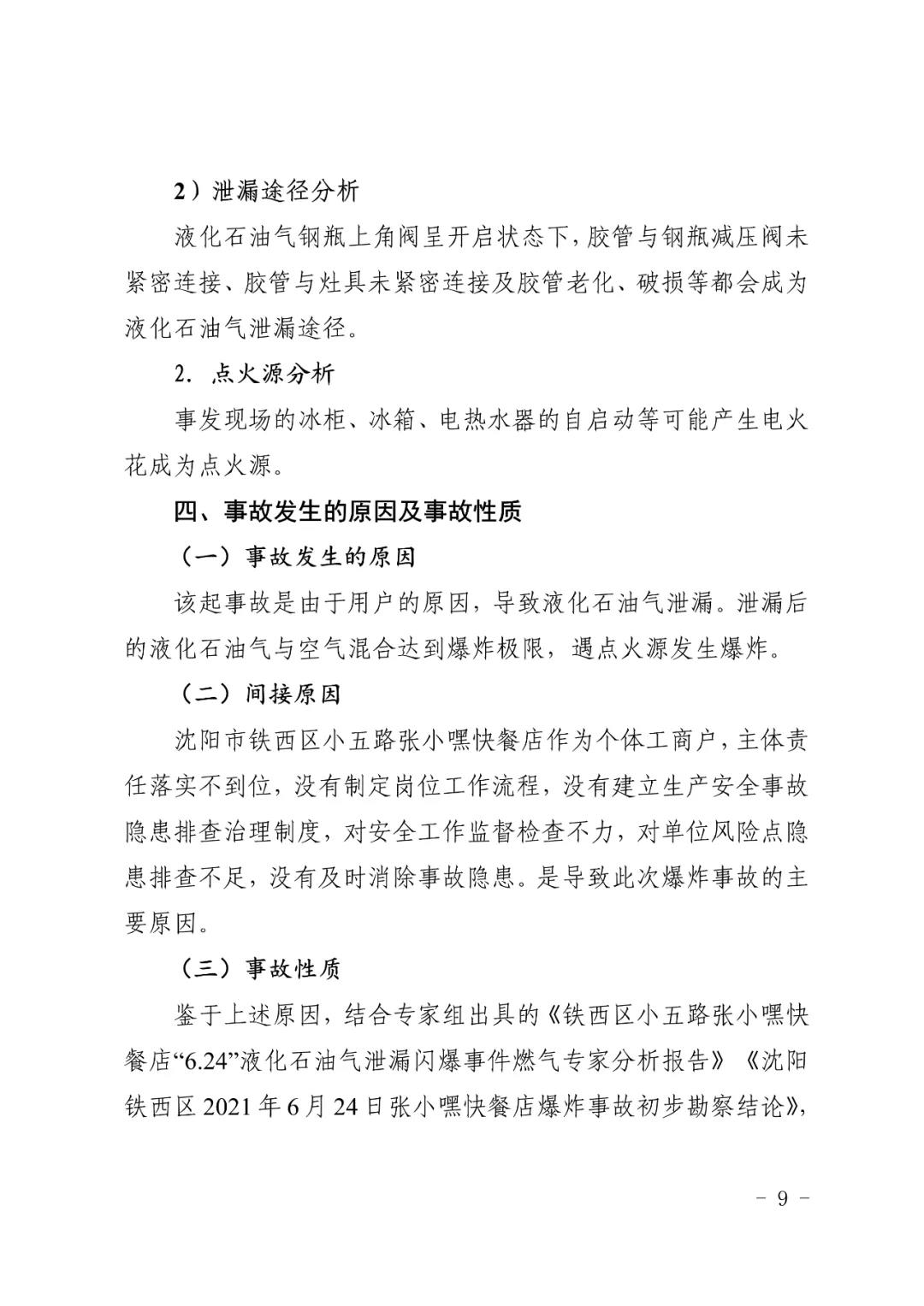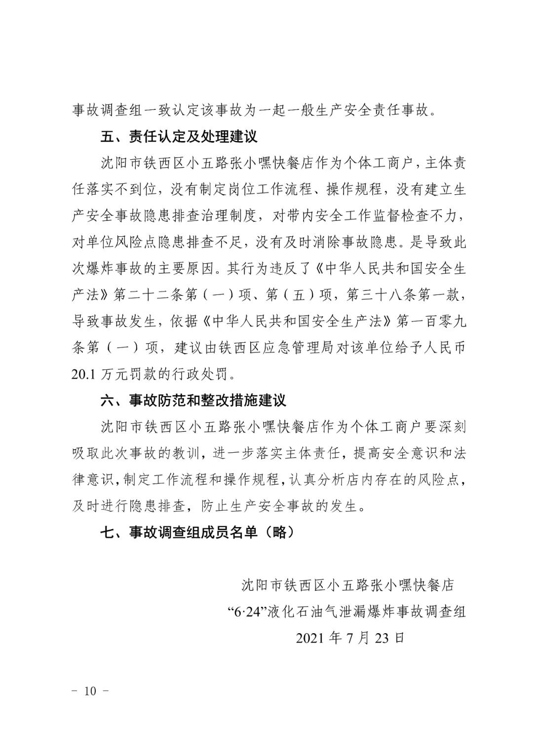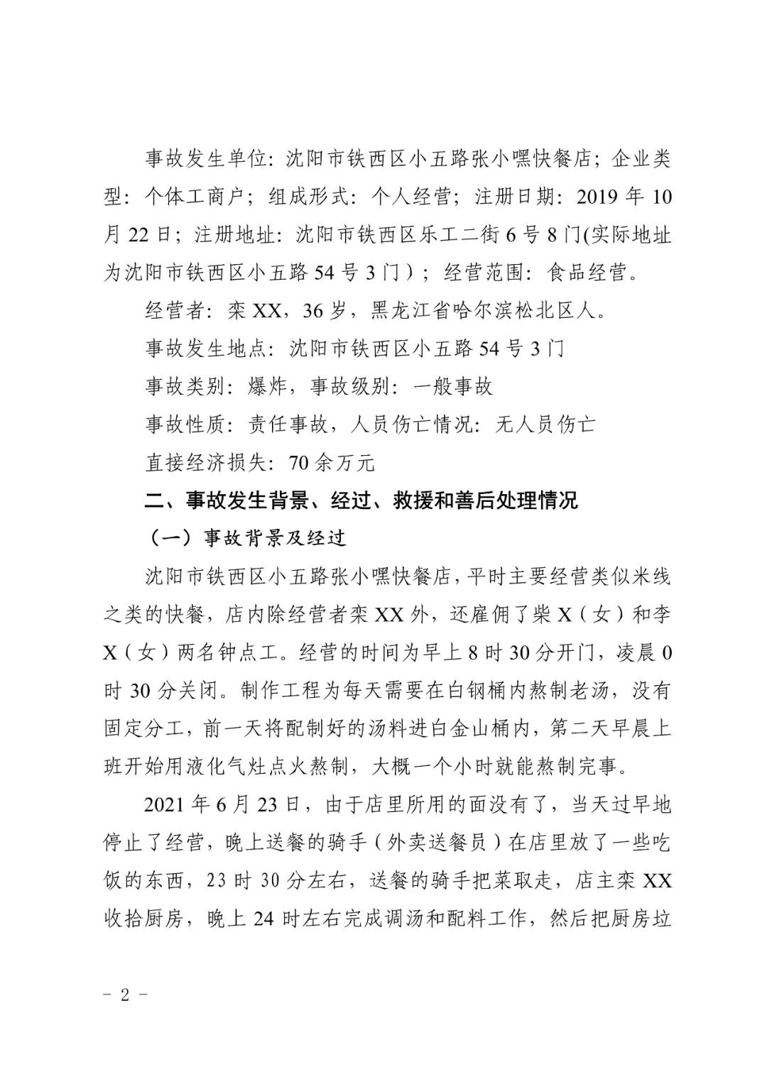 2021 年 6 月 24 日 4 時(shí) 11 分左右,位于沈陽(yáng)市鐵西區(qū)小五路 54 號(hào) 3 門,沈陽(yáng)市鐵西區(qū)小五路張小嘿快餐店內(nèi)發(fā)生液化石油氣泄漏爆炸,無人員傷亡,直接經(jīng)濟(jì)損失 70 余萬元。