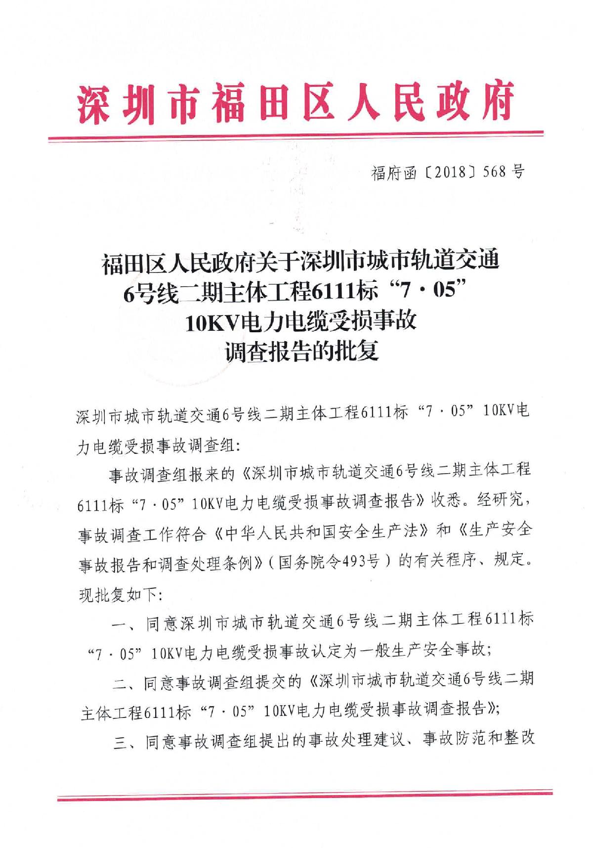 福田區(qū)人民政府關(guān)于深圳市城市軌道交通6號線二期主體工程6111標(biāo)“7.05”10kv電力電纜受損事故調(diào)查報告