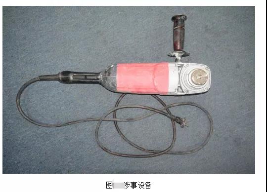 涉事設(shè)備產(chǎn)品名稱為角向磨光機(jī),所有人:彭小共,型號(hào):S1M-HL02B-180,電源電壓:220V-50Hz,額定空載轉(zhuǎn)速:8400r/min,功率:2600W,砂輪外徑:φ180mm,生產(chǎn)單位:蘇州聚匠人五金工具有限公司,銘牌處還有閱讀說(shuō)明書提示標(biāo)識(shí)和佩戴護(hù)目鏡提示標(biāo)識(shí),測(cè)得涉事設(shè)備的砂輪片安裝軸直徑為φ25.4mm。涉事設(shè)備的前端部位為金屬材質(zhì),其余部位均為塑料材質(zhì)。