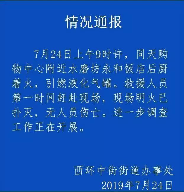 7月24日上午9時(shí)許,同天購物中心附近水磨坊永和飯店后廚著火,引燃液化氣罐。救援人員第一時(shí)間趕赴現(xiàn)場(chǎng),現(xiàn)場(chǎng)明火已撲滅,無人員傷亡。進(jìn)一步調(diào)查工作正在開展。