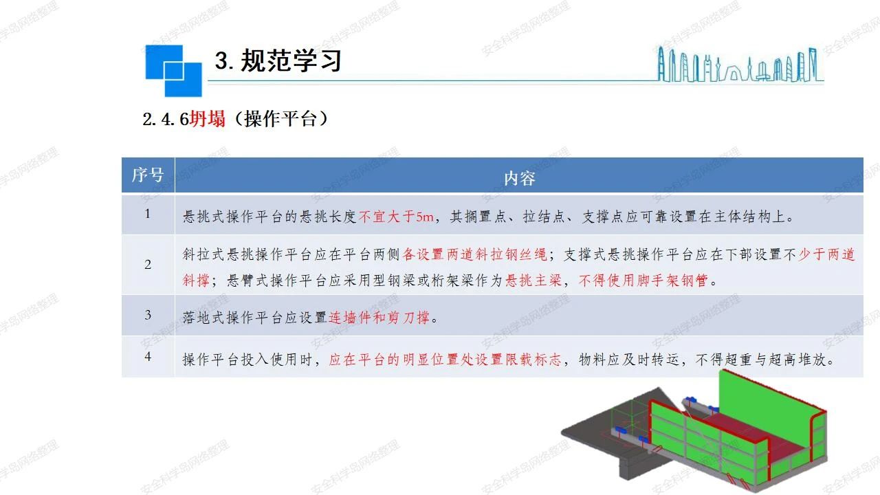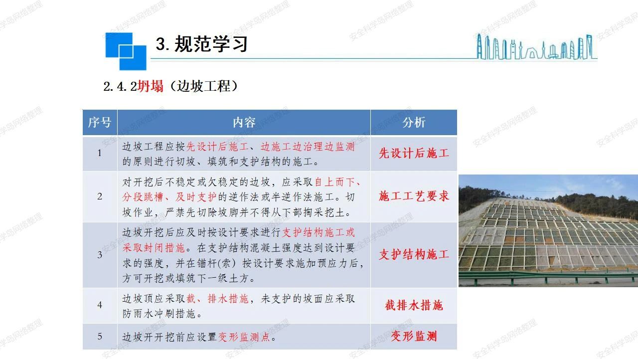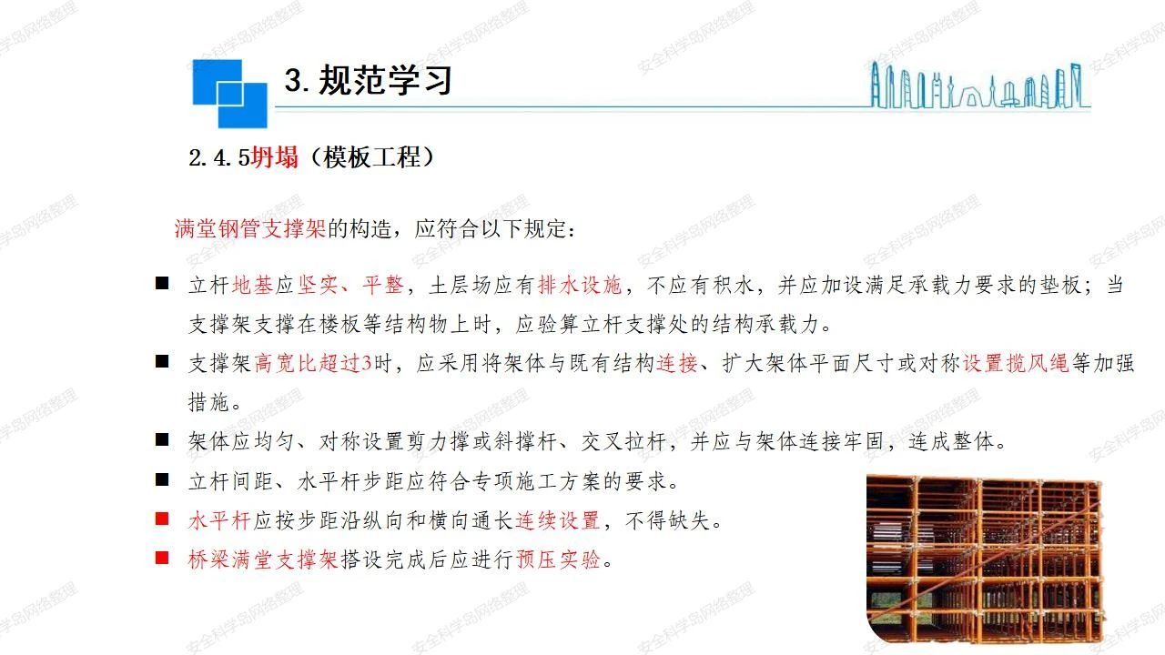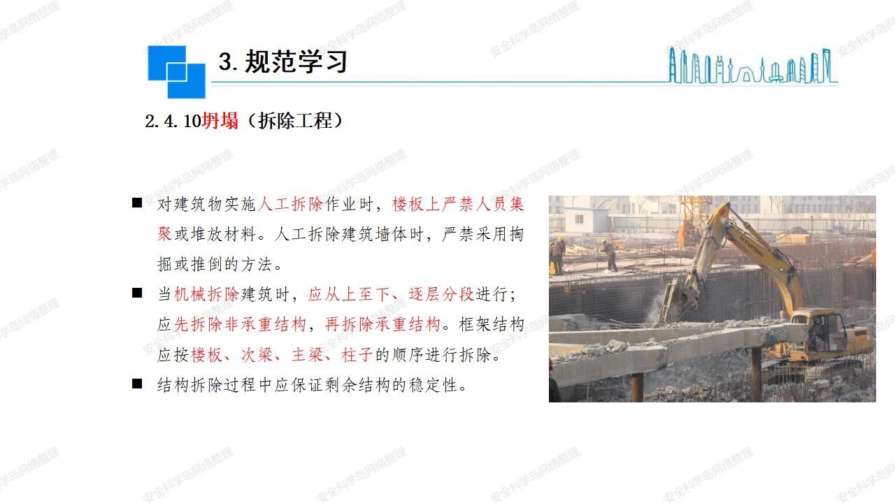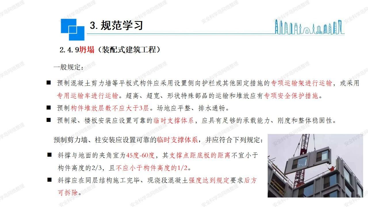 那么,坍塌事故發(fā)生的原因何在? (1)工程結(jié)構(gòu)設(shè)計不合理或計算失誤。 (2)施工前沒有編制切實可行的施工組織設(shè)計和專項施工方案,未做具體技術(shù)安全措施交底,特定施工項目未經(jīng)專家評審論證。 (3)腳手架、模板支撐、起重設(shè)備結(jié)構(gòu)設(shè)計不合理或計算失誤。 (4)建筑物結(jié)構(gòu)質(zhì)量低劣,安全性能差,地基不穩(wěn)定,不均勻沉降。 (5)建筑物結(jié)構(gòu)支撐連接(焊接)不牢固,超載、外力沖擊或嚴重偏心載荷造成失穩(wěn)等。 (6)腳手架及高大模板支架架體結(jié)構(gòu)不符合設(shè)計與規(guī)范要求,整體安全穩(wěn)定性差、超載或嚴重偏心荷載,遇外力沖擊或振動,不按程序拆除架體等因素造成失穩(wěn)等。 (7)基坑、土石方挖土?xí)r土壁不按規(guī)定留設(shè)邊坡(甚至負坡度),缺乏支護或支護不良,土質(zhì)不良或出現(xiàn)地下水、地表水的滲透,土壁經(jīng)不起重載側(cè)壓力或遇外力振動、沖擊等因素造成土壁失穩(wěn)滑坡坍塌。 (8)起重設(shè)備技術(shù)安全性能差,結(jié)構(gòu)強度不夠,安全防護裝置不完善,垂直起重機與建筑物拉結(jié)差,出現(xiàn)超載、碰撞、升降過度或違章操作等原因,造成起重設(shè)備倒塌。 (9)現(xiàn)場作業(yè)環(huán)境不良,安全防護設(shè)施缺乏。 (10)施工現(xiàn)場管理松弛,各項質(zhì)量、安全管理制度流于形式。 (11)片面追求經(jīng)濟利益,偷工減料,施工質(zhì)量差。 (12)施工隊伍素質(zhì)差,不執(zhí)行法規(guī)、標(biāo)準(zhǔn),違章指揮、違章作業(yè),思想上存在盲目性、冒險性、隨意性。 如何預(yù)防坍塌事故? (1)根據(jù)設(shè)計與規(guī)范要求,認真編制施工組織設(shè)計和專項施工技術(shù)方案、應(yīng)急預(yù)案,做好特定施工項目專家評審論證及技術(shù)安全交底工作。 (2)支架、腳手架等搭設(shè)完成后應(yīng)組織相關(guān)部門驗收。支架還應(yīng)按方案要求進行堆載預(yù)壓。 (3)嚴格控制模板支架、腳手架等承受的荷載,模板、腳手架及其支撐體系的施工荷載應(yīng)做到均勻分布,并不得超過設(shè)計要求。嚴禁超載、對構(gòu)筑物進行外力沖擊或偏心載荷。 (4)基坑、土石方挖土?xí)r土壁按規(guī)定留設(shè)邊坡,嚴格按照設(shè)計坡度進行放坡開挖,進行有效支護和排水,并設(shè)置專人對邊坡穩(wěn)定性進行檢測。基坑應(yīng)基坑頂邊緣1m范圍內(nèi)禁止堆放材料。 (5)加強起重設(shè)備的采購管理,嚴禁使用不合格的起重設(shè)備,并定期進行檢測,確保各項性能和安全防護裝置良好;加強起重設(shè)備的安裝、拆除管理;加強起重設(shè)備的使用管理,嚴禁超載、碰撞或違章操作;加強對起重設(shè)備操作人員、指揮人員、安拆人員的安全教育培訓(xùn),考核合格后持證上崗。 (6)加強施工現(xiàn)場管理,設(shè)置有效安全防護設(shè)施。 (7)加強對從業(yè)人員的培訓(xùn)教育,提高隊伍素質(zhì),強化質(zhì)量、安全意識。 (8)強化工程質(zhì)量報驗和檢驗、簽證制度,不經(jīng)檢驗合格,不準(zhǔn)進行下道工序施工。 (9)發(fā)現(xiàn)坍塌事故的險情,要認真分析原因,積極研究提出排除隱患的整改措施,并監(jiān)督執(zhí)行。