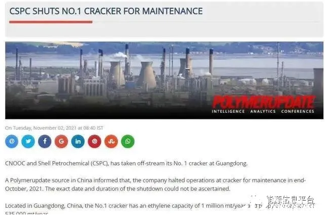 另外,中海油殼牌位于廣東的第一裂解裝置近日進(jìn)入維修。消息人士透露,此次維護(hù)暫時(shí)無(wú)法確定關(guān)閉的確切日期和持續(xù)時(shí)間。該裂解裝置乙烯生產(chǎn)能力為100萬(wàn)噸/年,丙烯生產(chǎn)能力為53.5萬(wàn)噸/年。