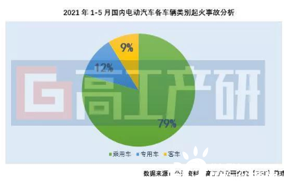 從各事故發(fā)生的動(dòng)力類型來看,2021年1-5月純電動(dòng)車型依然是起火事故占比最大的車型。
