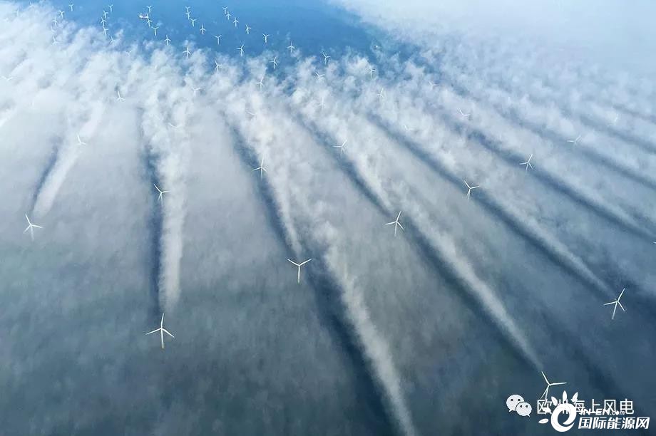 Horns Rev 1是全球第一座商業(yè)化規(guī)模的海上風(fēng)場,最早由沃旭開發(fā),安裝了80臺2MW Vestas風(fēng)機,葉輪直徑80米,輪轂高度80米,總裝機160MW。場址所在位置風(fēng)功率密度398W / m2,最遠(yuǎn)離岸距離18公里,最大水深14米。下圖這張顯示風(fēng)機尾流影響的著名照片就來自于這座風(fēng)場。