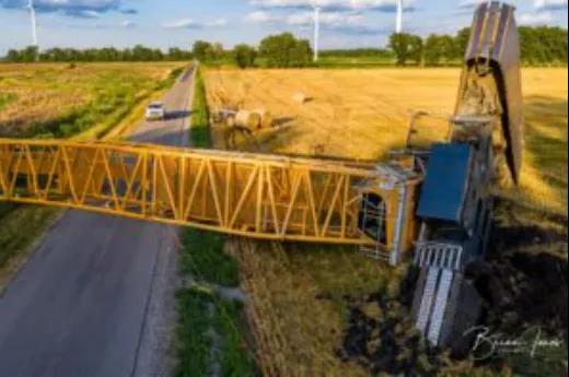 該風電場項目準備安裝 61 臺渦輪機,最大發(fā)電量為 219.6 兆瓦。該項目將覆蓋約 50,000 英畝土地。事故吊車屬于當?shù)匾患绎L能和太陽能公司,當時這輛800t履帶吊車正用于安裝風電機組,該風電機組通常位于雅芳北部和特里普西南部。當時疑似下方地面松軟,未進行吊裝前的勘察工作,負載過高造成大規(guī)模下陷,從而導致整車側翻。