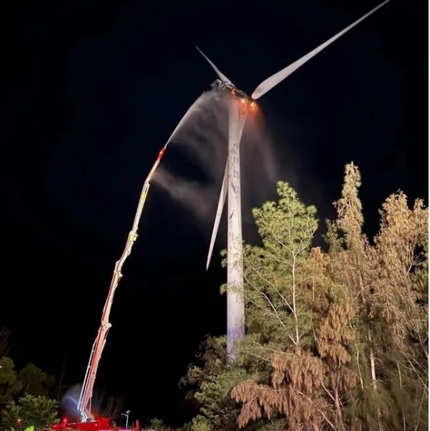 23時許,消防救援人員到達現(xiàn)場。經(jīng)偵查現(xiàn)場為海南東方高排風力發(fā)電有限公司的17號風機機艙著火,燃燒機艙墜落物導致地面樹林有多處雜草起火。了解現(xiàn)場情況后,指揮部立即做出戰(zhàn)斗部署:一是設(shè)立警戒立即疏散周邊圍觀人員防止高空墜落物傷人,并設(shè)置現(xiàn)場安全員,觀察現(xiàn)場救援環(huán)境;二是利用城市主戰(zhàn)車出槍撲救地面雜草火;三是利用62米舉高噴射車撲救發(fā)電機艙明火。