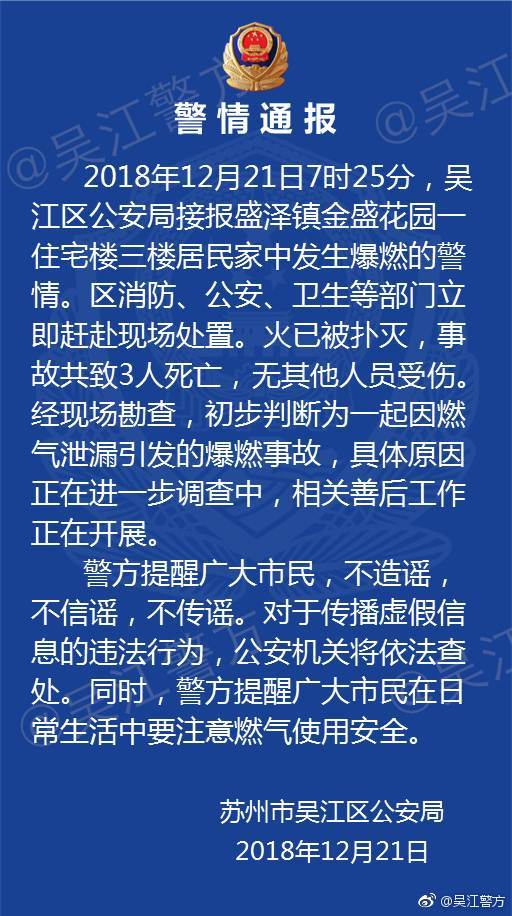 蘇州吳江一小區(qū)疑似發(fā)生煤氣爆炸事故共致3人死亡,無(wú)其他人員受傷