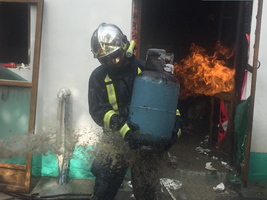 “當(dāng)時(shí)也有點(diǎn)害怕,煤氣罐閥門被燒壞了,如果不搬出來(lái),在里面燃燒會(huì)更危險(xiǎn)。”消防戰(zhàn)士武傳祥說(shuō)。
